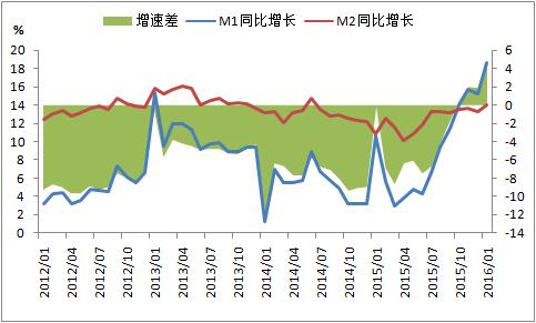 2016年1月末,M1和M2分别同比增长18.6%、14%,增速较上月同期提高3.4和0.7个百分点。其中,M2增速攀升,主要是信贷投放带动派生存款大幅增加。M1增速攀升,主要是1月份央行通过开展逆回购、MLF、SLF等多元化货币政策工具向市场净投放逾万亿元基础货币。